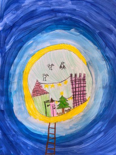 Beim Ausmalen bekommen manche Häuser noch Weihnachtsdeko, Mützen oder Tannenbäume. Am Ende wird noch alles schwarz umrandet und der Hintergrund gestaltet. (Text: Anna-Lena Köhler)